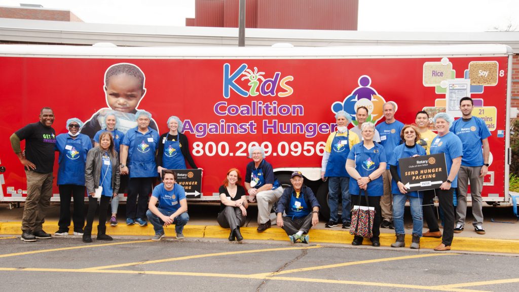 Rotarians and friends celebrate loading the KCAH trailer after a morning packing 32,000 meals in 100 minutes!