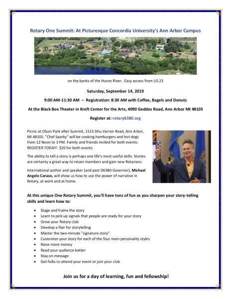 Join us at our District 6380’s Rotary One Summit. This year’s theme is The Amazing Power of Story. This event is only $20 (breakfast and a barbecue meal included), and is suitable for family and friends to join as well. Click here to register and get more information.