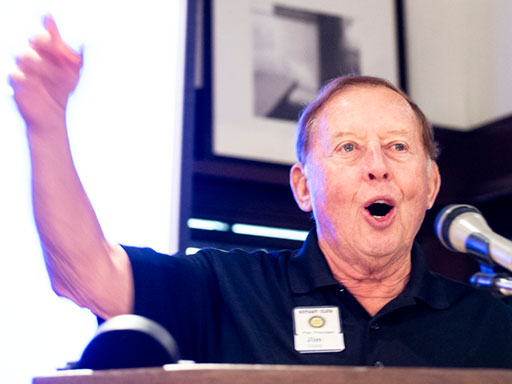 Song-master Jim Irwin then took the podium. “Today’s Rotary orchestra is none other than our own Tom Strode!” After the applause Jim regaled the audience with a story in honor of our speaker: “At an early age I noticed the difference between country and city speech. My home town is Detroit, and I would say ‘Woodward Avenue.’ My grandfather, on the other hand, would say ‘Woooward Avenue.’ We’re going to sing ‘The Farmer in Detroit — Go Detroit!”