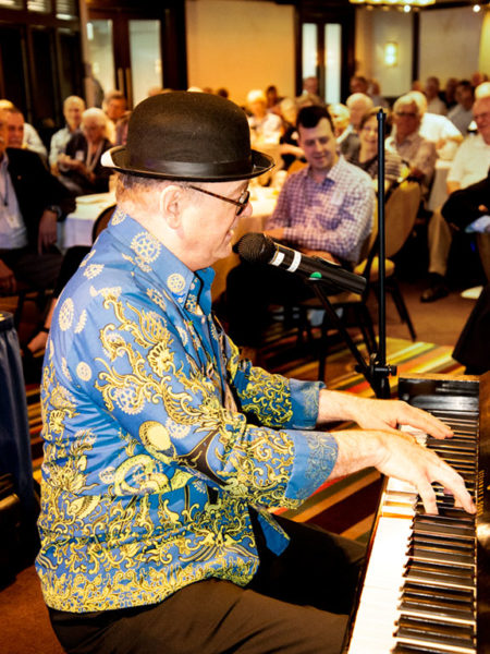 A smiling man bedecked in bowler hat and outlandish green shirt — a shirt sporting a confetti of Rotary wheels — stood next to President Greg. In a moment he was at the piano, hammering away as if in a scene from “The Cheyenne Social Club”. The man was, of course, our immediate past president, John Ackenhusen. He sang a song of his own composition called “John the Prez” (to the tune of “Mack the Knife”), a joyful summation of his administration. It went something like this: