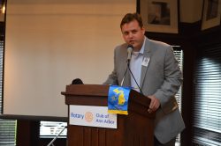 Golf and Tennis Outing: Committee chair John Simpkins returned to the podium to request additional auction items and to urge members to register for play and/or the dinner. “As you know, the GTO is our largest fund raiser and social gathering. If you have any items [or services] you would like to donate for the auction, please contact me. Thank you.” GTO is September 10, at Travis Pointe Country Club, 10:30 a.m. – the duration.