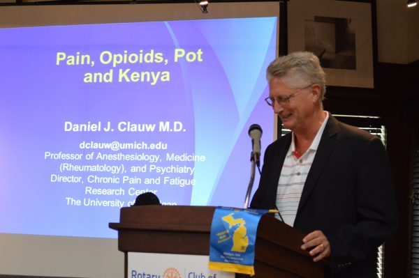 Medical Marijuana. Dr. Clauw cited marijuana’s effectiveness in ameliorating certain kinds of pain, particularly the chemical component CBD (Cannabidiol). “CBD really helps, not THC, which is what people want to get high.” He remarked that one problem with most medical marijuana dispensaries is that they sell high-level THC, “the kind used by recreational users.” He invited audience members to contact his office about reputable dispensaries. “There is one that we have confidence in, and work with.”