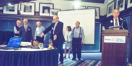 The anthems began with “God Bless America” and ended with “O Canada.” Joan Knoertzer’s virtuosity was decidedly on tap as the latter song was a spontaneous request from President John, a result of his remembering our contingent of Canadian brass — District Governor Barry Fraser and his wife, Carolyn. The Frasers, along with past Assistant DG Paul Schissel and Anne Nauts, were in Ann Arbor to preside over the District 6380 Conference held at Marriott Eagle Crest. They had also attended our Club’s “Spring Fling” at historic Yankee Air Museum — a memorable evening, indeed.