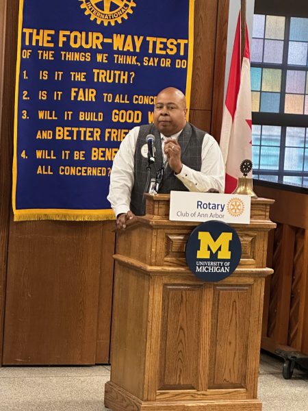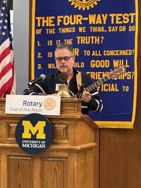 Club member Roger Fraser, who was Ann Arbor’s City Administrator 20 years ago, began his introduction with a shout-out to guest Geoff Larcom. Larcom’s dad was Guy Larcom, Jr., Ann Arbor’s first City Administrator from 1956-73, and for whom City Hall was named in 1995.