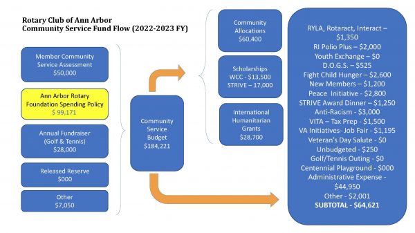 This Foundation was initiated in 1985 and is managed by a Board of Trustees with the goal of supporting humanitarian projects, improving the environment, educational opportunities, to name a few. In the last 15 years, we’ve distributed over $900,000, and the current value of the endowment fund is $2.2 million. Some uses of the fund are $60,000 in community allocation, $13,500 in scholarships to Washtenaw Community College, $17,000 to the Strive program and $28,000 in international humanitarian grants. Other programs who receive funds: RI Polio Plus, Rotaract, Peace Initiative, et al.