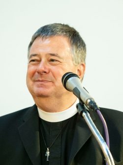 Speaker: Dennis Powers came up to introduce our speaker, the Rev. Alan Gibson. “Pilgrimages are journeys to seek out places where the Divine has intersected with our world,” Dennis began. “Some faiths [Islam, for instance] hold them as core values…Other faiths look on them as aspirational [Jewish people praying at the Western Wall]. Such searching for the abiding presence of God was an integral part of life in the Middle Ages.” Dennis then linked history with the present: “For us today…it is all but impossible to relate to what life was like for ordinary people in the Middle Ages — travel was hard…Outlaws preyed on solitary travelers…The journey along the Way of St. James nowadays is still focused on personal growth, self understanding, and spiritual awakening. Our speaker this afternoon will bring to life for us what that walk is like for the modern pilgrim.”