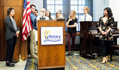 Joanne returned to announce that Abby is president-elect, and that “I’m going to be stepping down, but Andrew Sohn and Bev Seiford will be Committee chair and [deputy] chair, respectively.” Unanimous appreciation was expressed by the assembly to the Rotaractors and club leadership by thunderous applause.