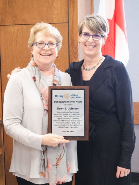 Past president Susan Froehlich introduced Dawn Johnson, recipient of the Distinguished Service Award. Here are Susan’s remarks: “Dawn Johnson, has been central to the success of our Club in the past few years. But first, let me tell you a little about the path that brought her to our Club. Dawn’s first college degree was in History and Art History, but her masters was in Healthcare Administration. The first part of her professional life was spent in this latter area of study. Receiving her masters in Boca Raton, FL she decided to stay in the state and worked at three different Retirement and Assisted Living institutions, the last two in the role of Executive Director. While still in Florida Dawn decided to return to her first love of the arts. Dawn had spent some of her growing up years outside of New York City and was a frequent visitor there. Her father and his wife are both artists. Many of the skills she had developed in healthcare, such as facility management, Human resources and financial management, were also valuable in arts management. From 2001 through 2012 Dawn took on several different positions with the Tampa Museum of Art, rising to the position of Deputy Director in her last two years with the organization. In June of 2012 Dawn made the decision to take the position of Associate Director for the U-M Kelsey Museum of Archaeology. Before living outside of NYC Dawn had lived in Toledo, so she was familiar with the Midwest. Dawn was also interested in moving to Michigan because her father and his wife had settled here and Dawn liked the idea of being closer to them. Sensing, I’m sure, the great professional capability of Dawn, two of our members, Lois and Len Stenger, met her on a Kelsey trip to the Detroit Institute of Arts and started the process of recruiting her to become a member of RCAA. As a part of that process they introduced Dawn to Norman Herbert and he helped to convince her to join the Club. Dawn was with the Kelsey until 2022 at which point she took her current position with the UM Museum of Natural History as the Associate Director for Operations and Revenue. In this position Dawn handles building infrastructure, Darwin’s Café, financial management with the Director, revenue generating programs and human resource management. In our Club Dawn has served on our Board of Directors as the Director of Club Service which oversees the Program Committee and the many moving parts of our weekly meetings such as attendance, music, inspirations, greeters and room set up. When we moved into hybrid meetings after COVID the details of our meetings became even more challenging. In addition to her prescribed duties as Director of Club Service Dawn also volunteered to organize and lead the first River Clean up in fall of 2021 and lead the winter 2022 search for a new Club administrator. Her experience in dealing with HR in her UM positions made her the perfect person to lead us in that endeavor. Prior to serving on the Board of Directors Dawn served as chair of our Program Committee and chair of the Membership Committee before that. Dawn would like you to know that she is thankful to be a part of such a supportive community that has such a positive impact on local, national and international initiatives. She feels it is “always a great day to be a Rotarian”. Dawn has played an important role in many aspects of our Club and it is a distinct pleasure to be able to award her with this Distinguished Service Award.”