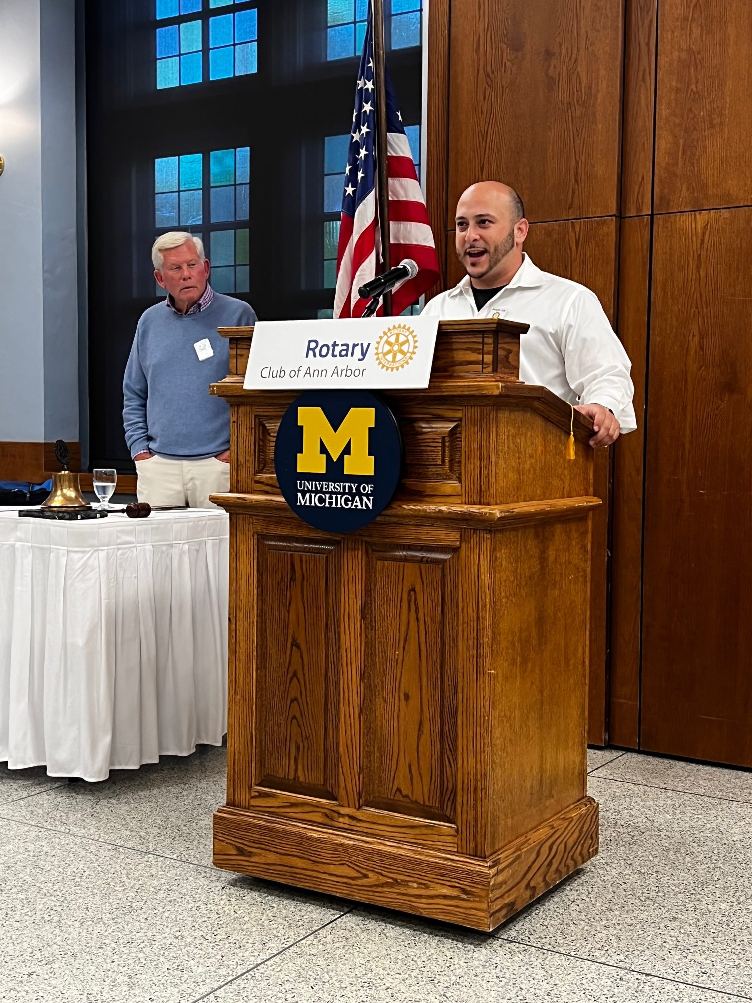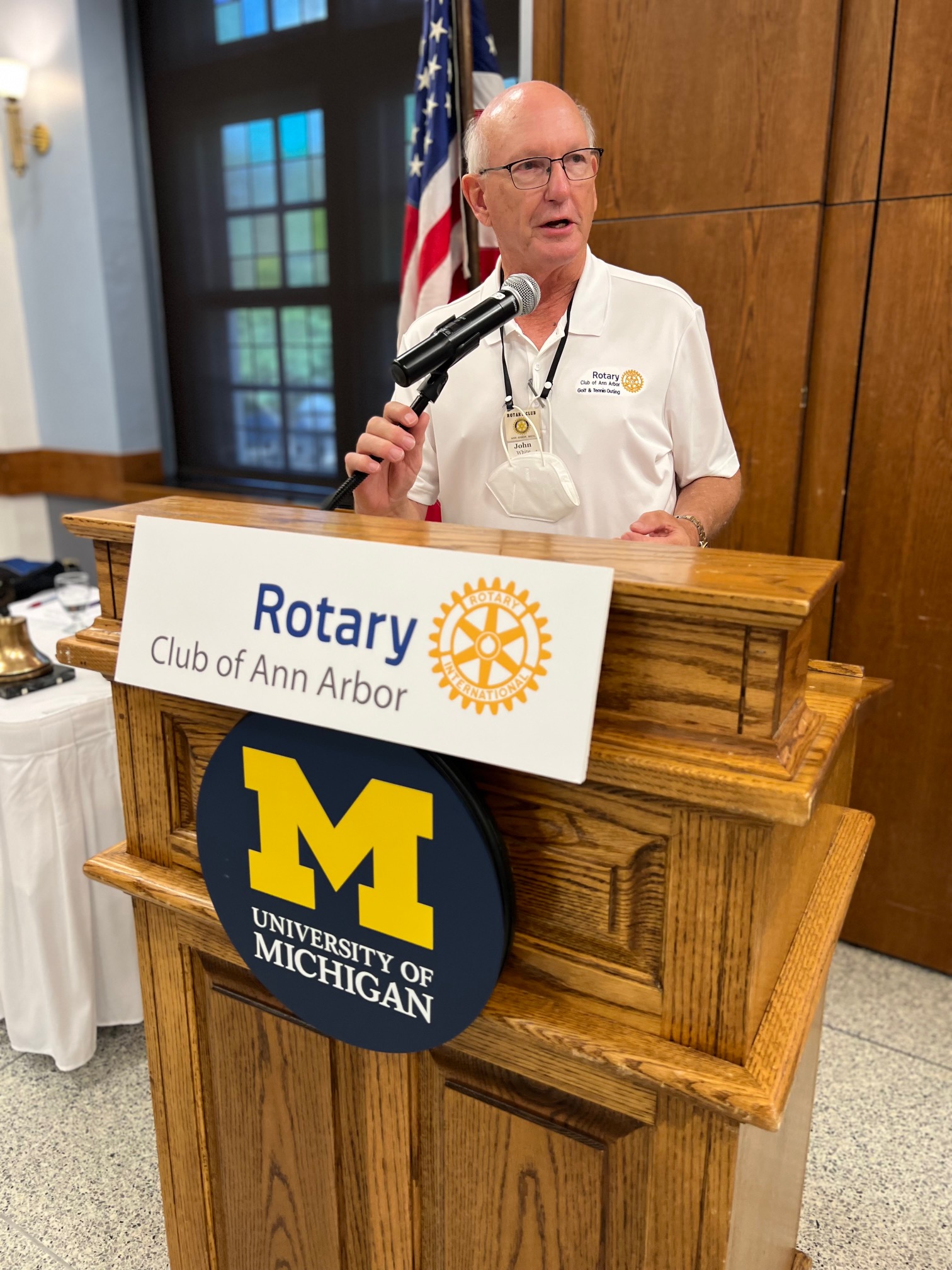 President Mark Ouimet opened the meeting at 12:30 on the day UM students returned to campus. Tom Strode played America the Beautiful. President Mark honored Tom’s 30-year service playing our patriotic song and Steve Pierce serenaded him with “He’s A Jolly Good Fellow”. Michael Barg announced the birthdays, including Tom’s.