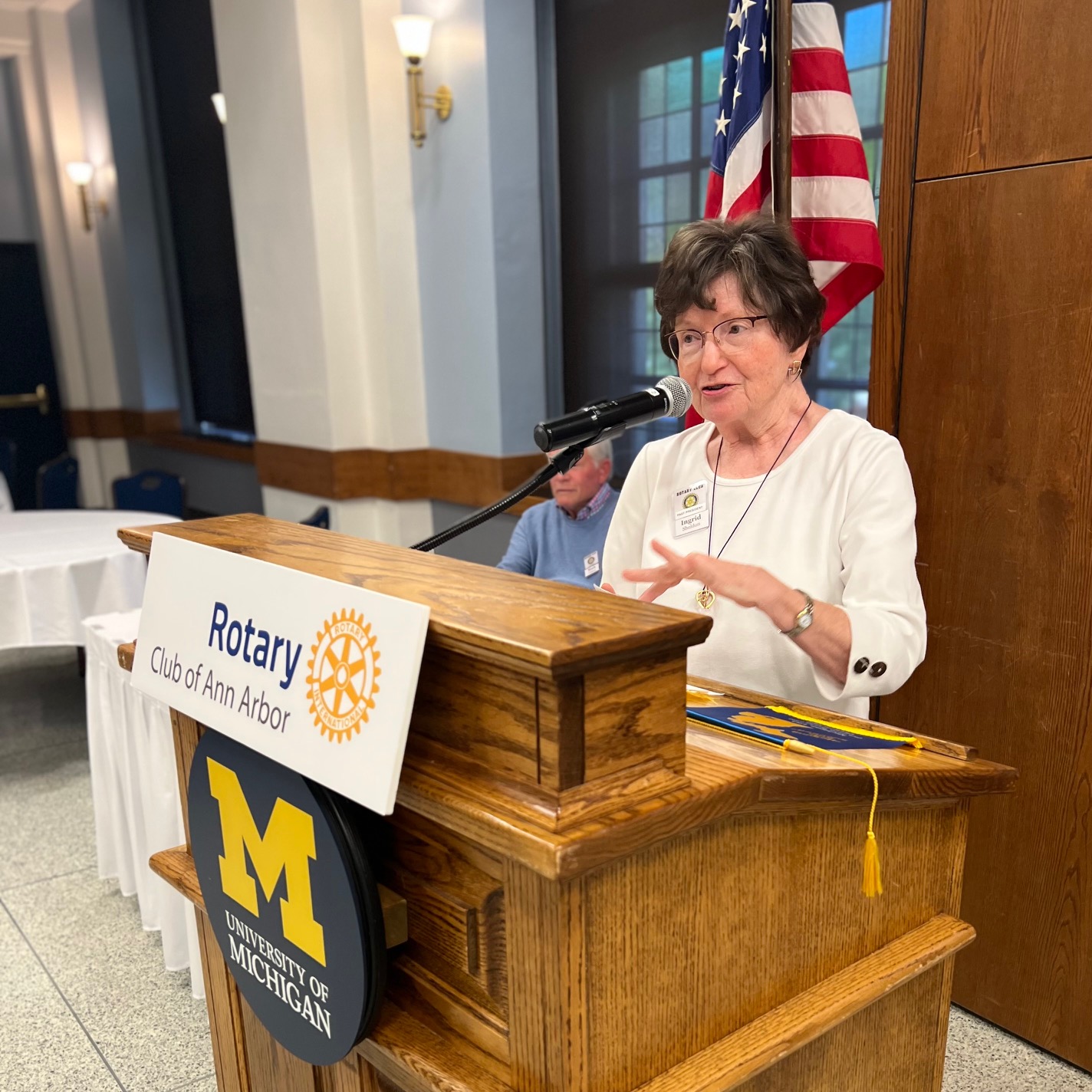 Guests of Mary Avrakotos and Lois Stenger were introduced, including a Global Grant Scholar from Japan. Rotary flags were exchanged.