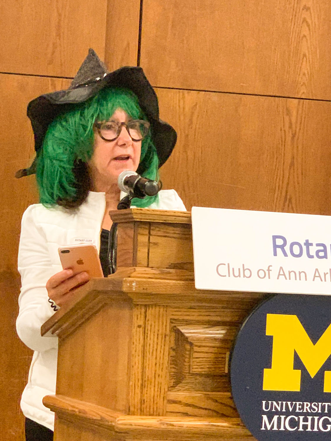 Lori Walters took the podium to talk about some of the social events available through the Golf and Tennis Outing Silent Auction. Sporting a green wig and witches’ hat, she invited us to the first Twisted Witches Brew Ha Ha on October 30. She also highlighted the Preview Party, Condo Crawl, Bob Buckler’s Elegant Pizza and Champagne Party, and Greg Stejskal’s ever-popular FBI tales dinner at Paesano’s. These social activities and many tempting items will be fully described in the auction catalog which will be available next week. These events are unique and unlikely to be repeated so you will not want to miss them.