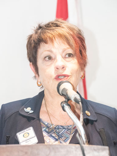 President Rosemary gaveled the meeting to order at 12:25pm. Dave Keosaian inspired us with a somber reading of John Donne’s No Man Is An Island. Joanne Pierson led us in a raucous rendition of Bill Withers’ Lean On Me. Thanks to the people who make the meeting run smoothly, birthday congratulations and introduction of guests completed the opening routine and preceded a string of announcements.