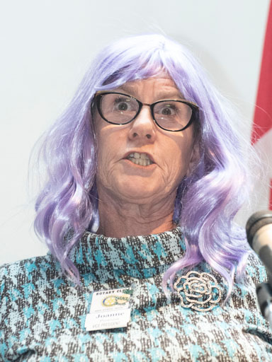 Joanne returned to the podium with an additional incentive for us to donate generously – donning a purple wig, she reminded us that President Rosemarie promised to “COLOR” her hair purple if we double our donations from last year.