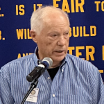 President Mark Foster rang the bell and Tom Strode, bedecked in a signature snazzy burgundy bow tie with teeny dots, played the National Anthem as we sang along.   Foster then informed the club that we were remembering Veterans Day early with today’s guest speaker.  With that message, Don Deatrick introduced our club’s eminent motivational inspirer, the late Art Holst.  Holst was reciting the moving poem, Freedom isn’t Free recorded at Hill Auditorium in 2018.  It remains as riveting today as ever.