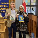 Visiting Rotarian Past President Alberta Longone Messer exchanged her club’s flag (Long Beach, MS) with President Foster.  She spoke about the compassion and care especially needed now for children, and was impressed with our club’s commitment to help kids succeed.