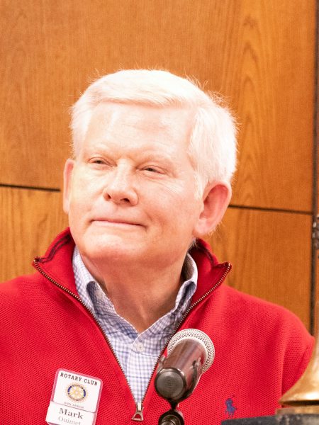 President Mark Ouimet welcomed a festive and happy crowd in the Union’s Anderson Room and a smiling array of Rotary Zoomers to Wednesday’s meeting. Our Club’s Orchestra, led and performed by ivory tickler extraordinaire Tom Strode, played our National Anthem.