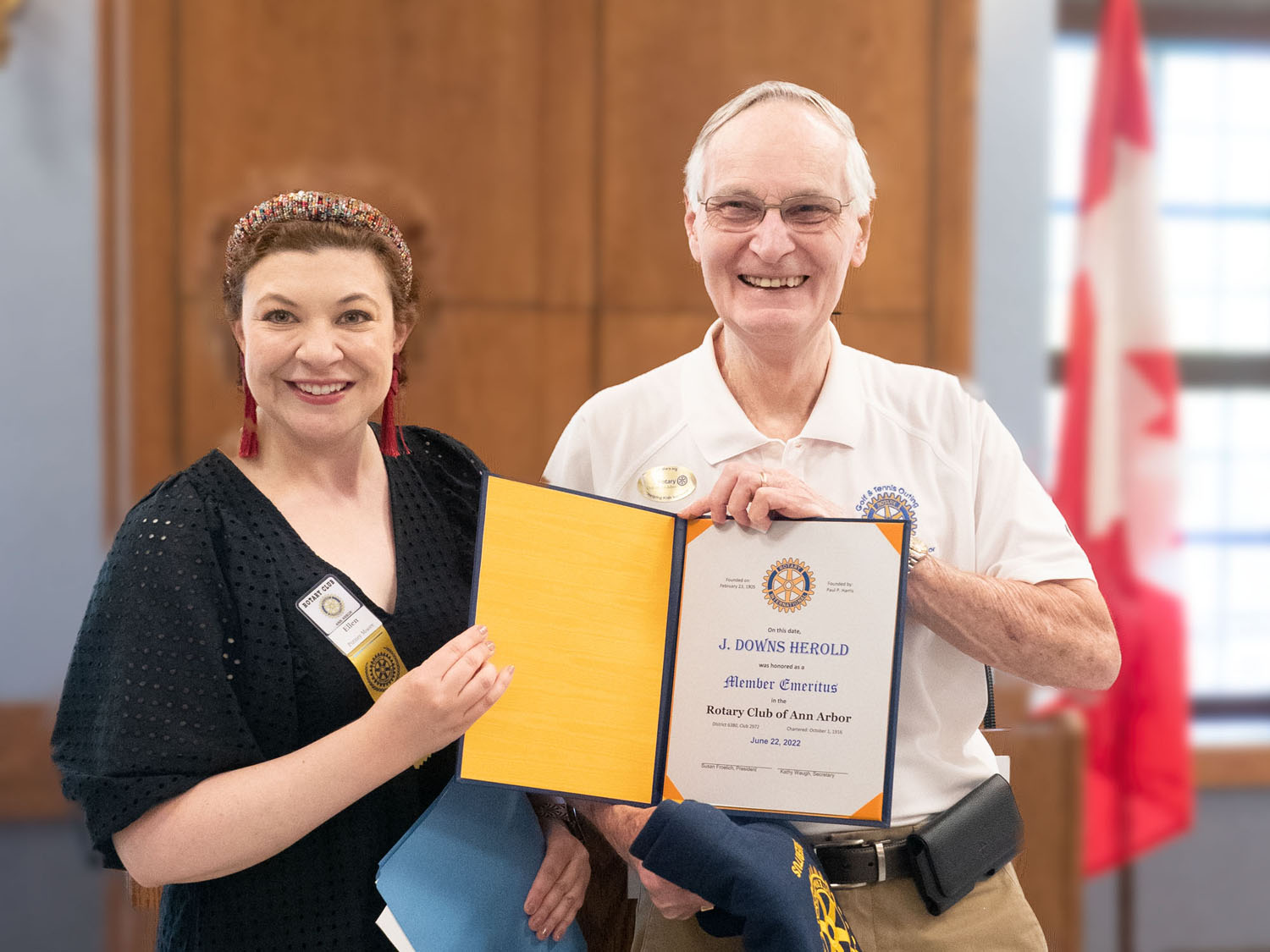 Ellen Putney-Moore presented the Emeritus Award to J. Downs Herold who exemplified “service above self”. Downs was always destined to become a Wolverine. While his parents lived in Bradford, Pennsylvania, they were both U of M alums, and Downs’ mother insisted on giving birth at the U of M Hospital, where she trained as a nurse. As you can imagine, there was no other option for Downs other than U of M for college where he received his Bachelor and Masters of Science in Biology and Microbiology. While finishing his Masters, he received a call from the U of M Extension Service regarding a conference coordinator position, which set Downs on a new career path that was “much more interesting than chasing bacteria around.” As the University Extension Service’s Conference Coordinator, and later Department Director, Downs was at one point running 300 events a year. It was through these positions that Downs helped to establish the Ann Arbor Convention and Visitor’s Bureau and he served as the U of M rep on the Ann Arbor Chamber of Commerce. Within the Chamber, Downs helped start an Innovation Center to help bring new tech jobs to the region, thus kicking off the tech movement in Southeastern Michigan. While helping run a forum for new businesses, he started the company Classic Collegiate China to design and produce commemorative plates and his favorite part of this venture was interacting with his diverse and international customers. Downs has been married to Sondra, for 58 years after a chance encounter at a U of M vs. MSU football game. They have a son and daughter, and seven fantastic grandchildren. Downs has been involved in a plethora of local organizations, including the First Presbyterian Church and, of course AARC which he has been a part of since 1979. As a member of Rotary, Downs has contributed in innumerous ways, including serving on the Program Committee, which he also chaired for two years; Board of Directors member, serving as President from 1995-96; Secretary from 2001-16; and Song Leader from 2000 to present. He received the Distinguished Service Award in 1999 and has been a Paul Harris Fellow. Downs expressed his appreciation for the Award and mentioned that Al Storey was his Rotary sponsor.