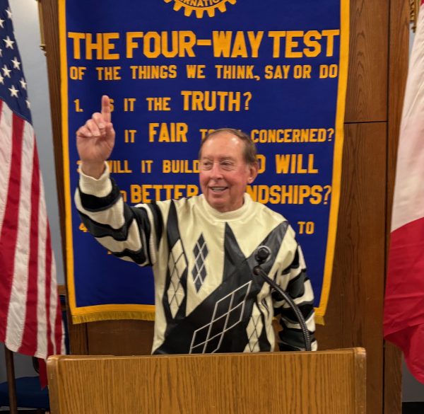 Jim Irwin, fresh from celebrating his 86th birthday and his 55th anniversary of being a Rotarian, led us in an up-tempo, a cappella edition of Varsity. Dr. Revelli, longtime UM music professor, band director of the UM Marching Band and Rotary Club member, would have been proud to hear us. Rah! Rah! Rah! Rah! Rah!