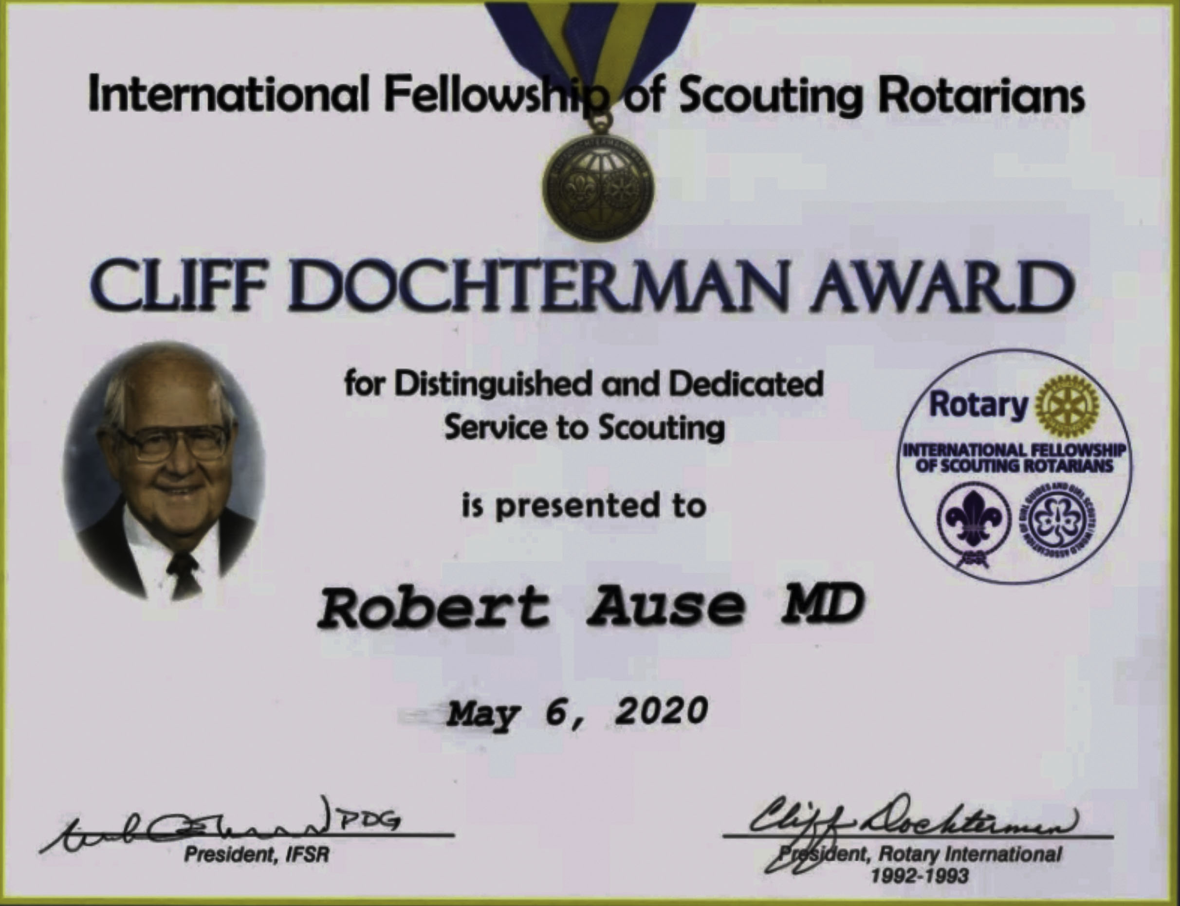 The Cliff Dochterman Award presentation was made to two deserving Rotarians who have supported scouting. Roy More presented the Award to Robert Ause, MD, a radiation oncologist who has been an avid supporter of scouting. Dr. Tim Johnson presented an Award to Paul Harris fellow, Jim Irwin, who was himself an Eagle Scout and served as President of the BSA Council. We were informed that about a quarter of our Rotary Club members are Eagle Scouts.