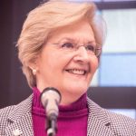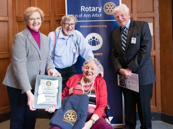 Bob Buchanan presented the Emeritus Award to Sue Beutler, extolling the many contributions Sue has made in her very full life, exemplifying Rotary’s “Service Above Self” mission. Sue’s service started when she was a mere teenager back in World War II and continued with a teaching career in the Ann Arbor schools where she received several Outstanding Teacher of the Year awards. Exemplifying her commitment to education, she pursued her own higher learning, earning a Ph.D. from the University of Michigan School of Education and (after retirement!) a Master’s Degree in Fine Arts in painting. Her service commitment also continued; she volunteered at the Turner Senior Center to initiate art activities for memory care individuals and served as a First Presbyterian Church Deacon for 8 years, as an Elder for 3 years, and sang in the Chancel Choir.