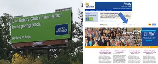 Sign on Interstate 94, Ann Arbor, MI, publicizing our Rotary club (L); transition from established website (top) to new website (bottom) (R).