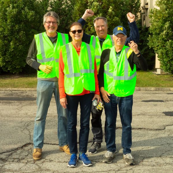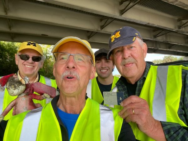 Rotary Road Waste Warriors were once again smiled upon by Señor sol for the State of Michigan Adopt-A-Highway fall trash pick up. Pictured above are members of the Rotary Club of Ann Arbor and UM Rotaractors who joined forces on Saturday, October 2, to attack highway blight on I-94. The road waste warriors, identified by clever name tags courtesy of John White, picked up trash at the same break-neck speed as the metal hulks hurtling past them on the highway. The attack on roadway blight resulted in the collection of 58 bags of trash, assorted car parts, hubcaps, pieces of tires, numerous masks, articles of clothing, an iPhone, credit card, large steak knife, saw blade, one filthy Grinch, and a suspected meth lab waste dump that was reported to authorities. After a short debriefing back at the Kensington Hotel parking lot, a complimentary box lunch and Rotary socializing was enjoyed by all.