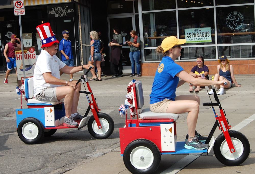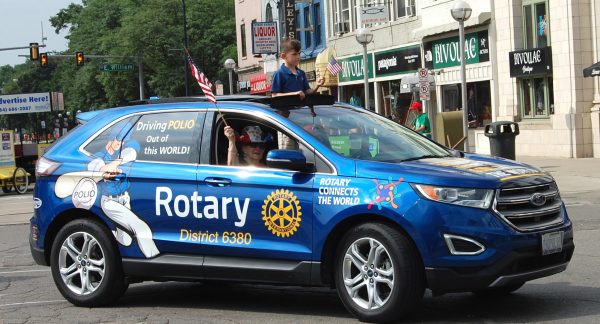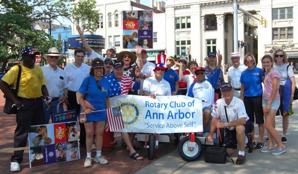 Anchored by DG Sparky’s RotaryMobile (see below), more than 20 Rotarians and family and friends marched in this year’s’ Ann Arbor’s Fourth of July parade. Our group included DG Sparky, his wife, and two members of the Rotary Club of Ann Arbor North. The goal was to highlight our work in Ann Arbor and around the world, and, of course to have some fun.