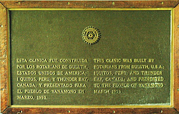 Amazingly, we were taken by boat to a nearby clinic staffed by a volunteer physician from Wisconsin. This clinic was the sole medical facility serving the inhabitants living within a radius of sixty miles. Near the clinic entrance was a brass plaque informing us that the clinic had been built by Rotary International—clubs from Duluth, Iquitos and Thunder Bay.