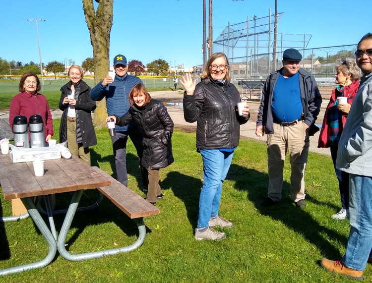 So, on Saturday, May 8, we held our first Saturday in the Park. It was a bit chilly out, but fueled by some Washtenaw Dairy donuts and some Bear Claw coffee, about a dozen of us gathered for some warm conversation at Veteran’s Park.