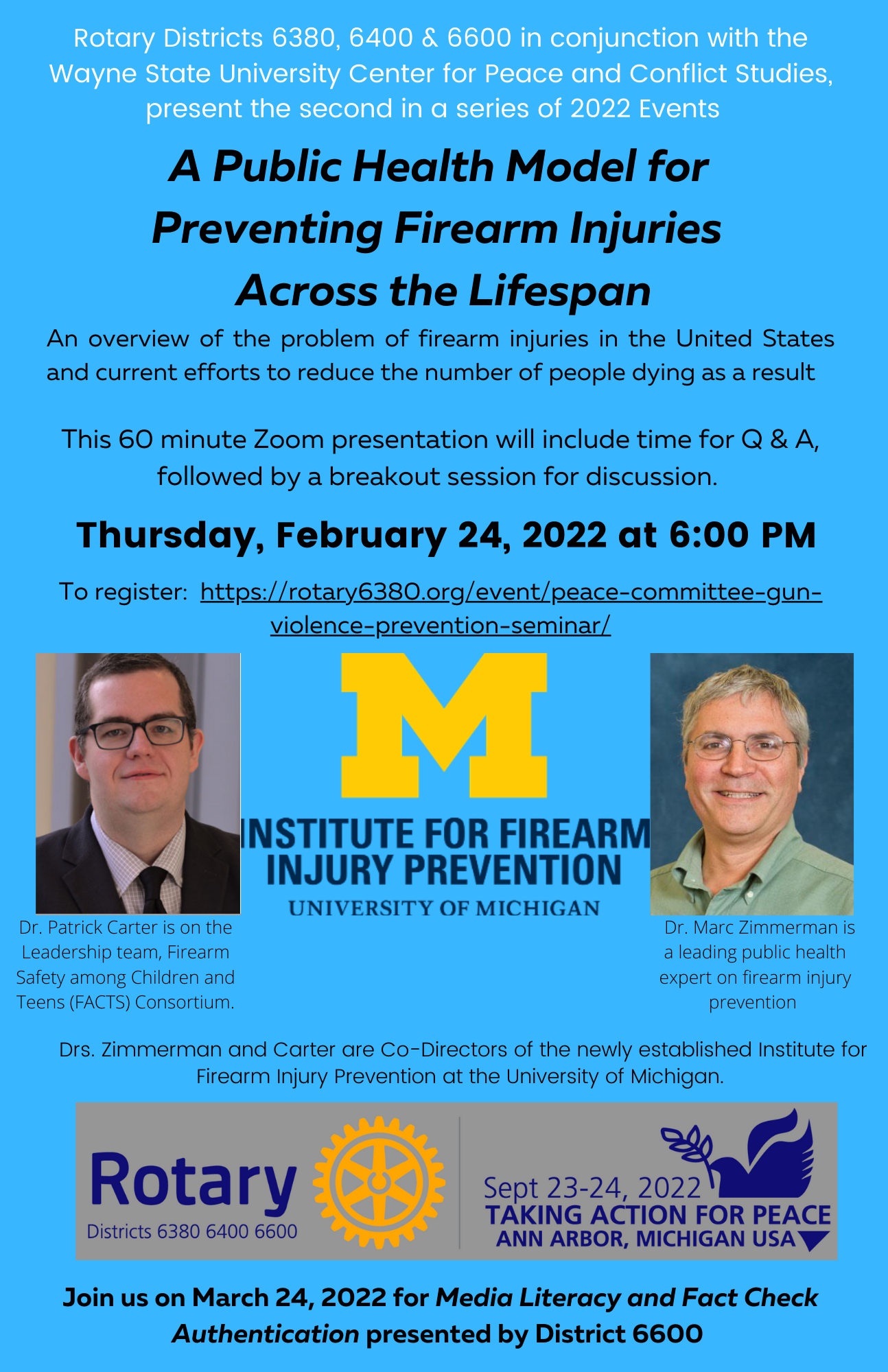 The District 6380 Peace Committee will be hosting a District-wide Seminar relating to Gun Control, Gun Violence and Prevention as our contribution to the Pre-Conference events. “Taking Action for Peace” Conference slated for September 2022. This event is open to any and all Rotarians, family, friends as well as other Districts. Primary contact is Marcia Lane 734-395-4428 mlane0407@gmail.com